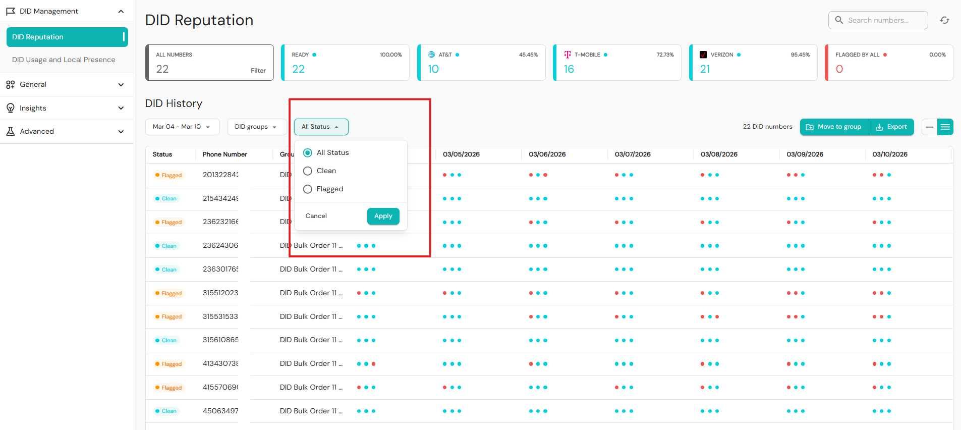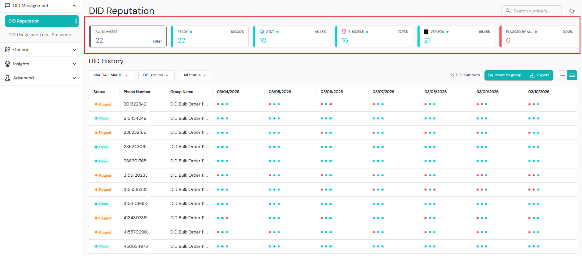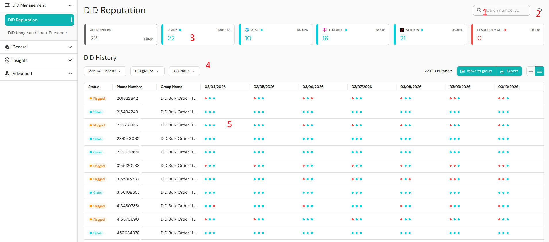 - Date – Always shows exactly seven days of data. Carrier dots indicate which major carriers flagged each phone number. Hover your cursor over the dots to see which carriers have flagged a number.