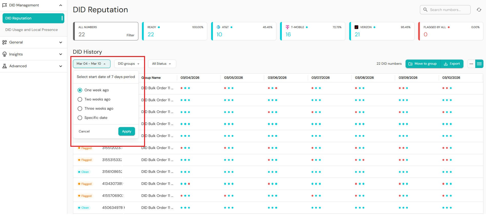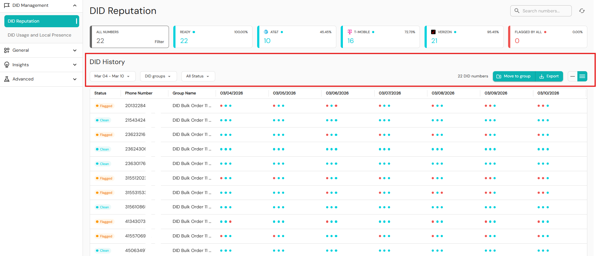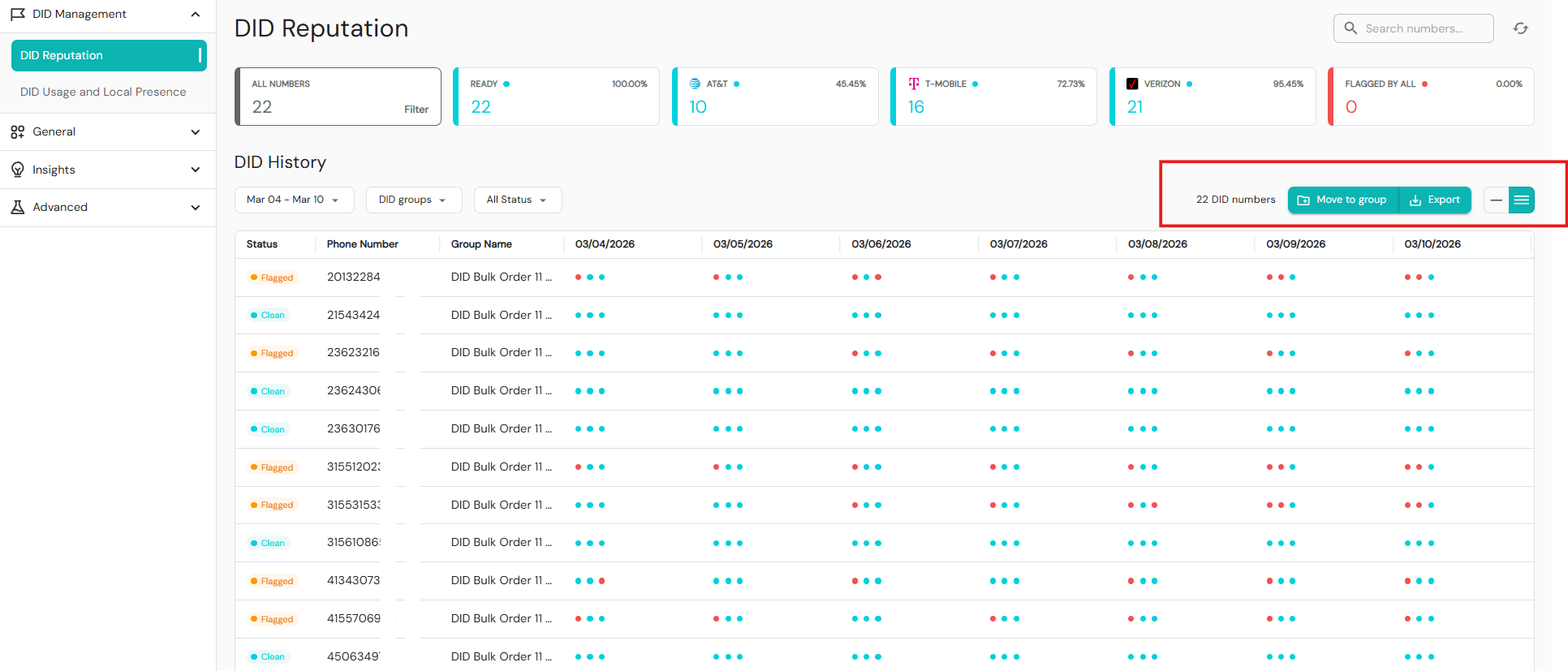 - Date – Always shows exactly seven days of data. Carrier dots indicate which major carriers flagged each phone number. Hover your cursor over the dots to see which carriers have flagged a number.