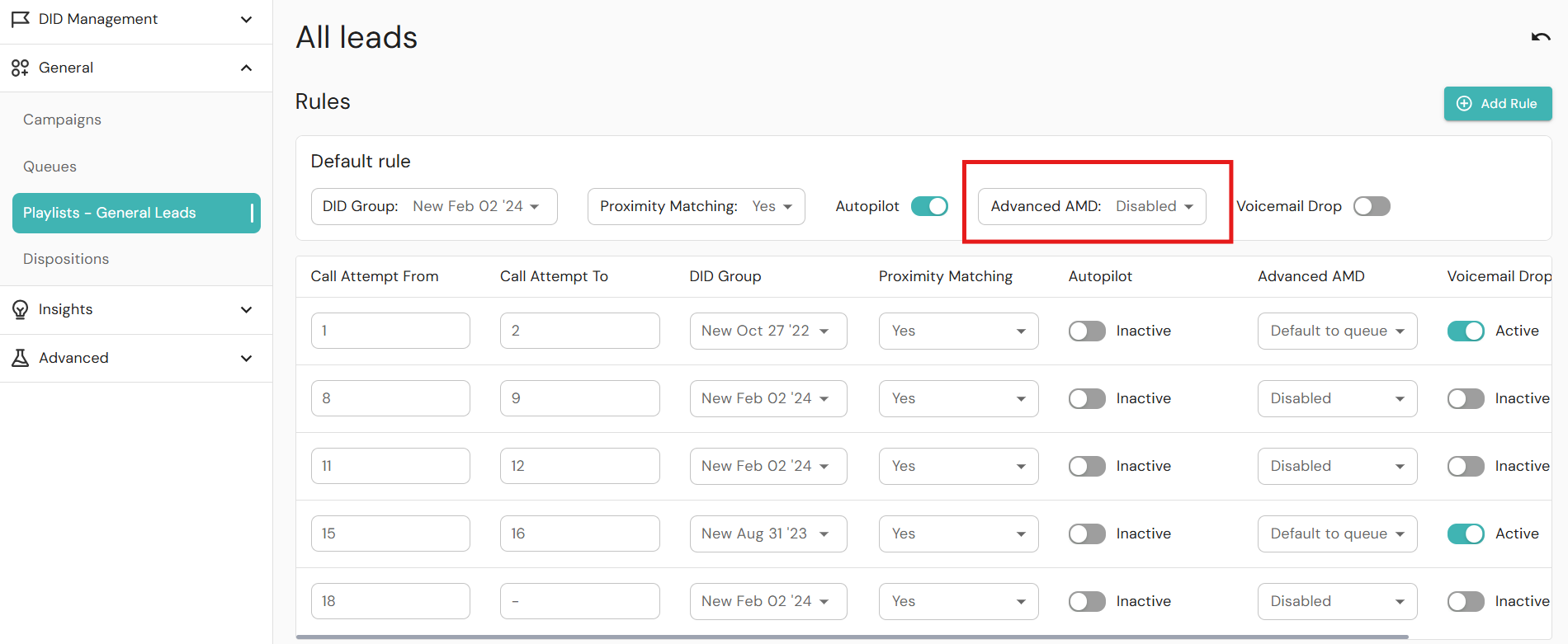Answering Machine Detection (AMD) lets administrators configure settings to identify whether a call has been answered by a human or an answering machine. New or modified AMD configurations are updated automatically in Readymode Starter and Readymode iQ. Using AMD, you can: