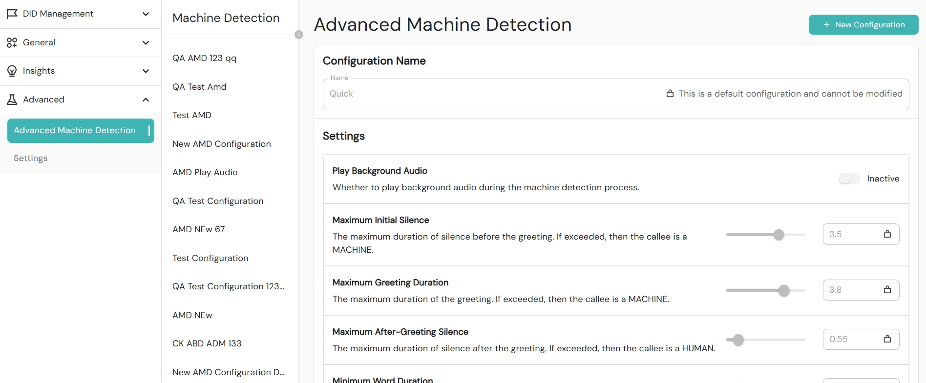 - Quick: When a call is answered, the machine detection algorithm does a quick check to assess whether a machine has answered a call. It will evaluate specific speech patterns for 3 seconds before deciding whether to patch what it hears through to an agent.
